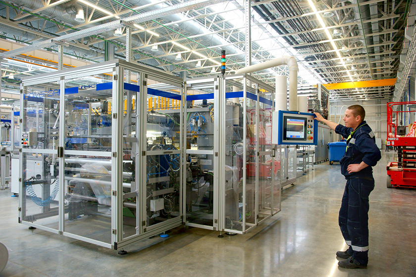 Комплектация новой линии включает непосредственно саму конвертинговую линию, две упаковочные машины производства компании Plus line (Италия), автоматический робот - паллетайзер и автоматические погрузчики Elettric 80 (Италия), а также паллетообмотчик Bema (Италия).