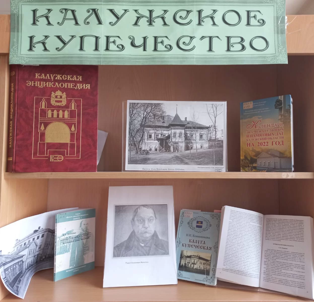 О купечестве много писала краевед Наталия Кожевникова, чьи труды представлены на выставке. Помимо книг на полках – копии старинных фотографий с изображениями исторических домов, а также портрет купца первой гильдии Павла Малютина. Напомним, московский купец Павел Семенович Малютин много сделал для Калуги. Его отец был родом из наших мест, однако в свое время обосновался в Москве, наладил там бизнес, который продвигал вместе с сыновьями. Малютины продавали ситец, веревки, торговали козьим пухом. Помимо того, они владели золотыми приисками в Сибири – так был скоплен большой капитал.