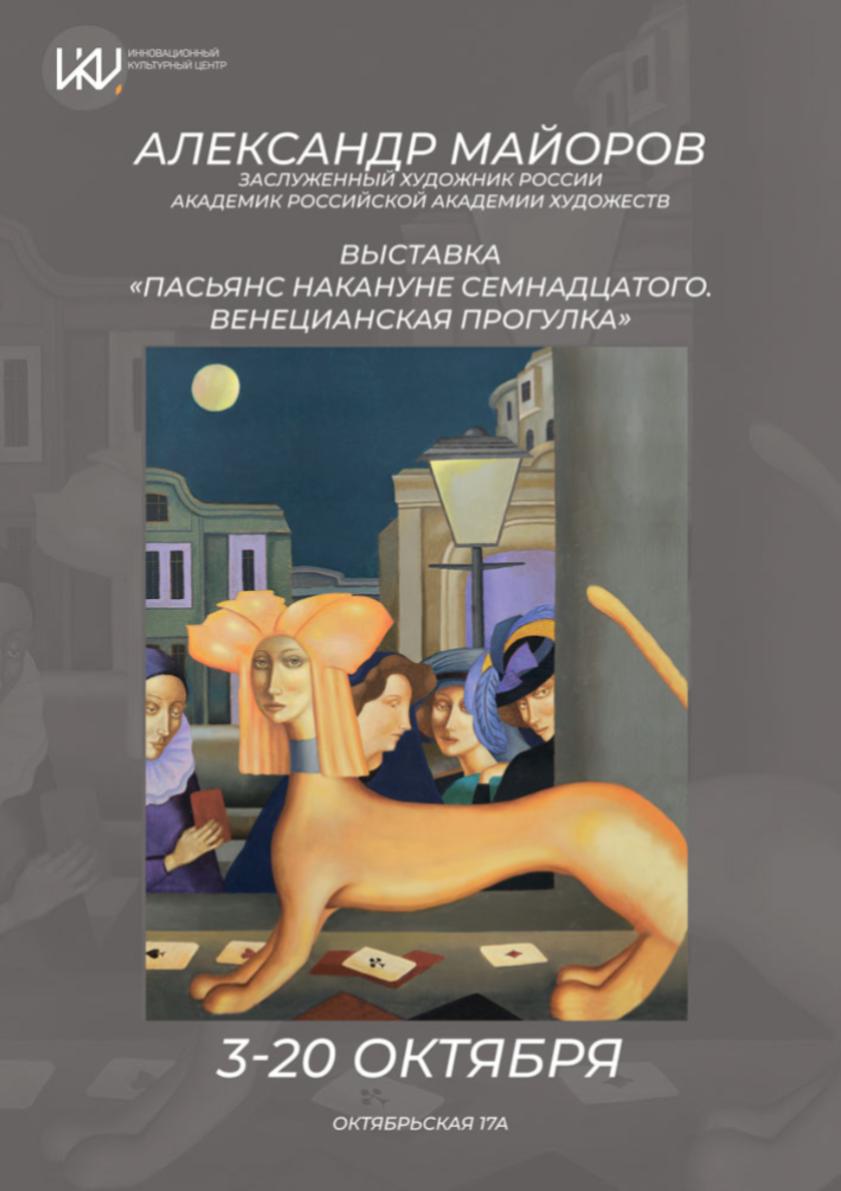 Циклы «Пасьянс накануне семнадцатого» и «Венецианская прогулка», которые будут представлены на выставке, написаны Александром Майоровым в 2016 – 2018 гг. «Пасьянс накануне семнадцатого» – обращение художника к русскому Серебряному веку, его наследию, судьбам его героев, к рубежному для России 1916 году. В «Венецианской прогулке» Александр Майоров, избегая шаблонных «туристических» видов Венеции, ведет диалог со зрителем о непреходящих ценностях, о великих мастерах, о русском культурном присутствии в одном из самых прекрасных и загадочных городов мира.