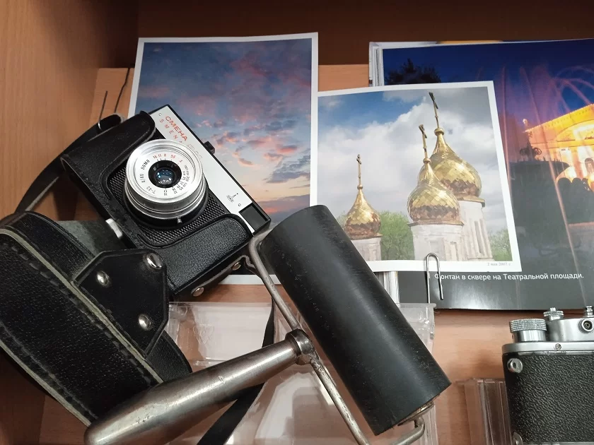 Экспозицию дополняет большой предметный ряд. У знатоков фотодела, несомненно, вызовут интерес советские фотоаппараты «Смена», «Зенит», «Зоркий». Они были лучшими в свое время, доказывая надежность возможностей. Кто-то из посетителей библиотеки, вероятно, вспомнит юные годы, молодость, когда именно такой техникой старался запечатлеть ярчайшие моменты своей жизни. Она, кстати, представлена калужскими коллекционерами Денисом Асосковым и Константином Винником.