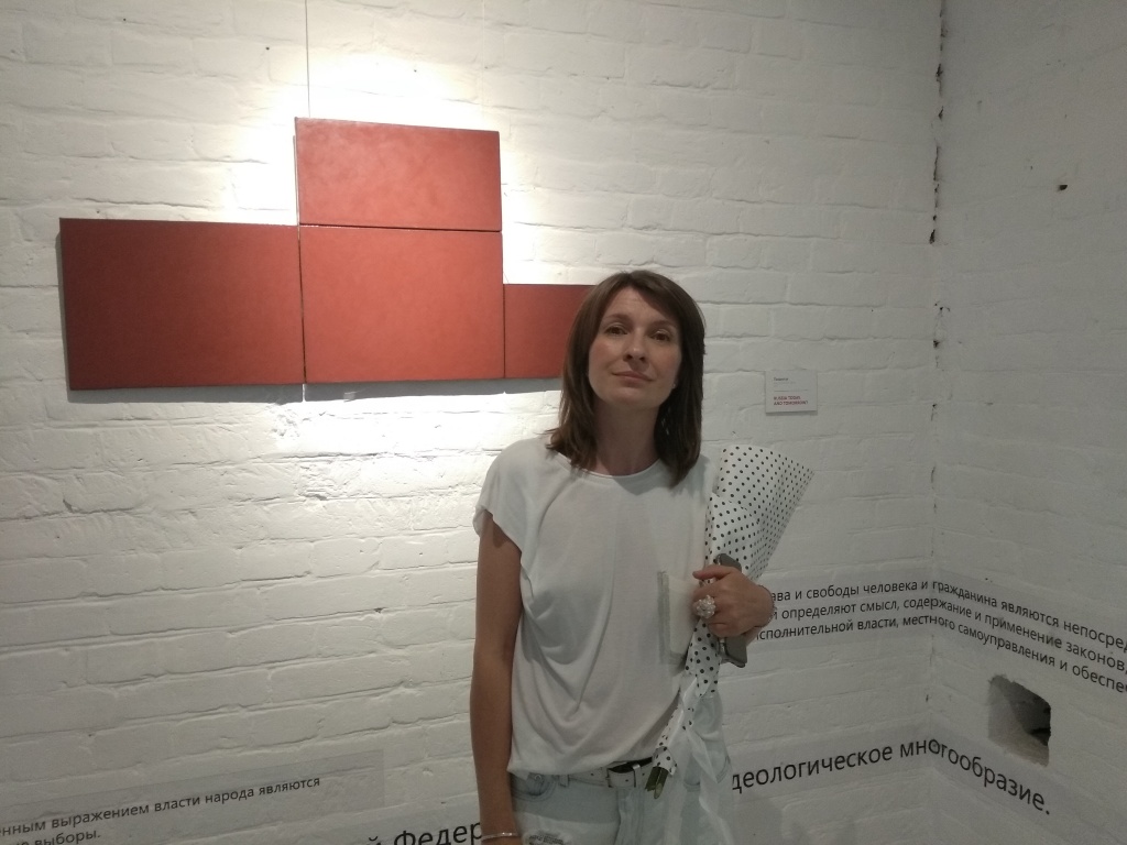 В экспозиции – 13 произведений-фигур. Абстрактные работы Агеносовой очень узнаваемы. В этом единстве гладко выкрашенных холстов в сочетании с четко сформулированными, отдельными текстами статей Конституции сосредоточен свой особый смысл. И, конечно, основной свод законов, по которым мы все живем (как его представляет творчески мыслящий человек). Автор смогла уловить и воплотить настроение окружающей действительности, рассказывая нам о нашем времени. В ее живописных образах – сердце нашей Родины – Красная площадь, духовные и материальные сокровища России, воплощенные в Золотой пирамиде, ступени как движение вверх и др.