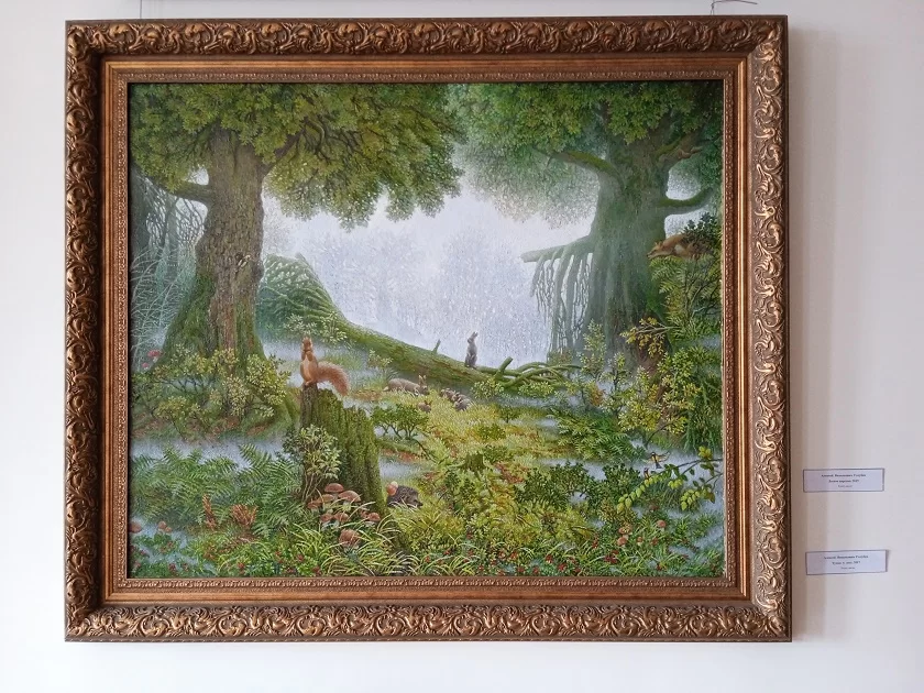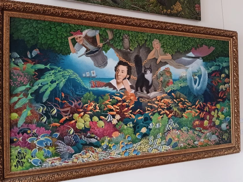 Эти картины наполнены неповторимой атмосферой и красками. Здесь зритель увидит картину на сюжет из стихотворения Пушкина «У Лукоморья дуб зеленый» - вступления к поэме «Руслан и Людмила», памятники калужской истории на фоне народных гуляний и фантастическое будущее. Кстати, именно эта фантастическая серия выполнена художником в графике.