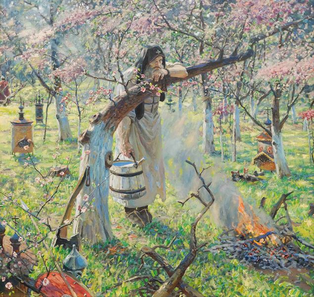 - И еще мне нравится картина «Ослябя». Он ее писал с себя, это его поза, его руки. Он стоит в яблоневом саду. Картина мне очень дорога.