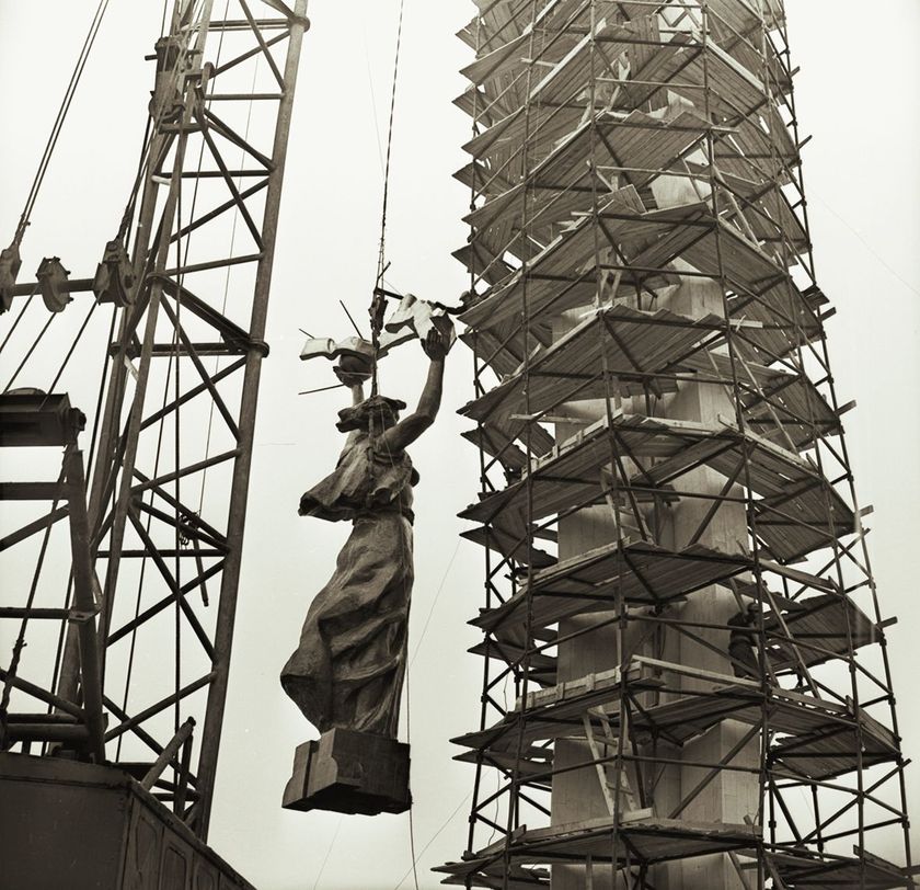 Об установке бронзовой фигуры Родины-матери снова заговорили только в 1973 году. Было решено водрузить её на уже стоящий с 1966 года обелиск народу-победителю, превратив его в удобный тридцатиметровый постамент для памятника. Работы по монтажу конструкции проходили в первом квартале того же года под руководством главного архитектора города Павла Перминова.