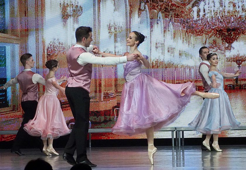 Занавес открылся, и ценители искусства благодаря чуду современных технологий, что называется – с корабля на бал, – попали в бальный зал с его торжественностью и парадным блеском. И сразу закружились в вальсе пары, они буквально парили над сценой. Собравшиеся восторженно наблюдали за воздушными движениями танцоров, их точеными жестами.