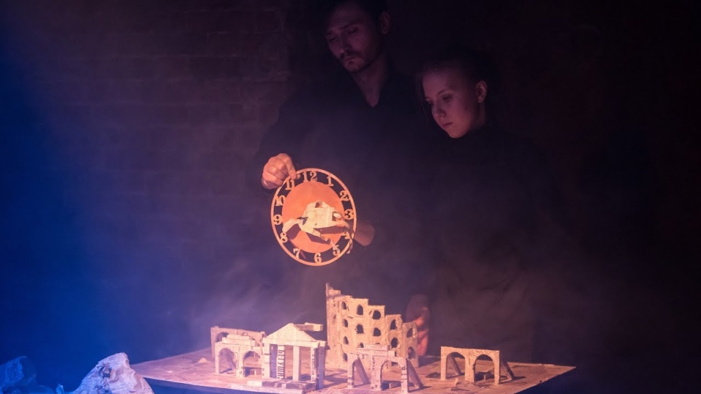 Весь театр уместился на большом столе, где мастерски из спичечных коробков, газет и прочих подручных средств был выстроен некий город, который и стал местом разыгрываемого спектакля. Все, что в нем происходило, – отражалось на большом экране, проецировалось оператором в мельчайших деталях. Зрители видели только освещенный стол, экран и едва уловимые силуэты актеров в черном, которые сливались с темнотой вокруг. Вспомнился один из кукольных спектаклей Образцова: кукловоды в черном одеянии почти не видны – не они главные, все внимание приковано к куклам. Так и в бумажном городе – темнота вокруг сделала четче очертания коробочек-строений, железнодорожных путей, газетных деревьев. Да и зрительский взгляд стал внимательнее и острее.