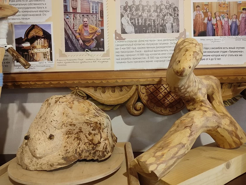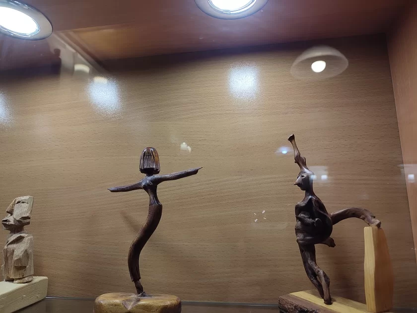 Выставка делится на два раздела. Экспонаты из дерева – корней, стволов, веток, которые частично обработаны и представляют собой фигурки людей, животных, птиц, – все это вместил первый и, пожалуй, самый большой раздел. Здесь есть скрипач, гимнастка, акробат, лыжник, старичок с клюкой, а еще заяц, олененок и даже сказочный Буратино – герои произведений Григория Кочубея, выполненные в технике корнепластики. Также гости Дома мастеров увидят фантазийные скульптуры, некоторым из них уже около 28 лет.