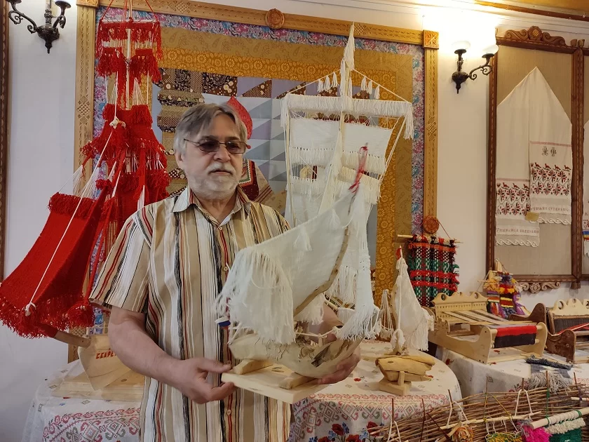Во втором разделе мы узнаем Григория Андреевича с необычной стороны, как мастера по ткачеству. Маленькие ткацкие станы он сделал сам, а потом начал на них большую работу – ткал гобелены и разноцветные панно, выткал алые паруса для своего корабля «Секрет» (как в повети Александра Грина) и белые, как символ чистоты, – для парусника «Ассоль» (в них скомпанованы корнепластика и ткачество). Любитель морской темы, он даже панно, на котором изображен маяк, украсил раковинами и галькой, привезенными с моря.