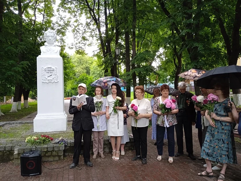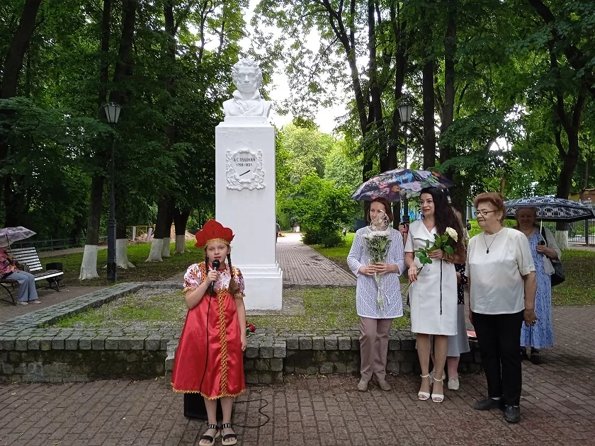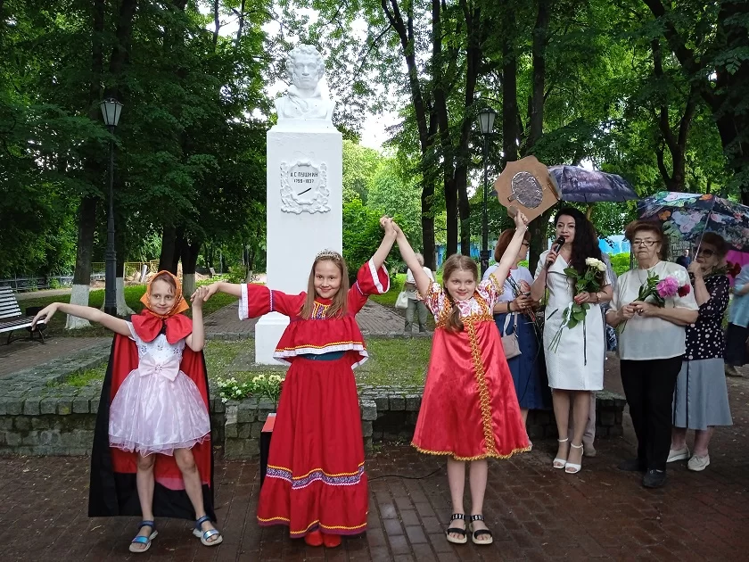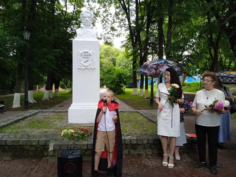 Здесь звучали стихи Пушкина и строки, посвященные ему. Несмотря на начавшийся дождь, дети тоже представили стихи и несколько сценок из сказок классика.