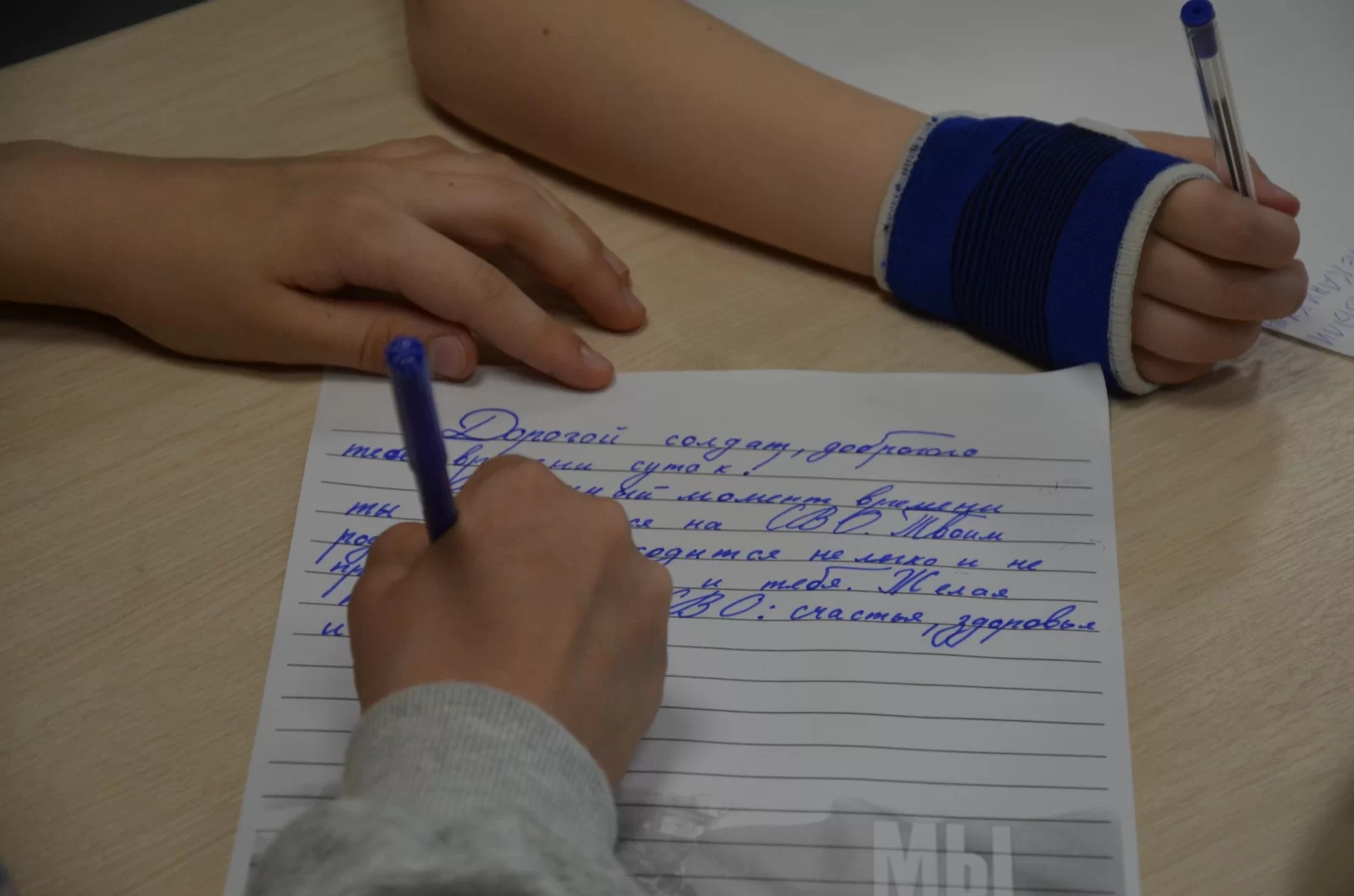 После активных развлечений ребят пригласили в помещение фонда и предложили заняться серьезным делам – написать письма участникам специальной военной операции. Дети военнослужащих писали своим отцам, остальные – незнакомым им защитникам Отечества. Ребята ответственно подошли к заданию. В своих посланиях они поблагодарили бойцов за их ратный труд и написали им свои самые теплые пожелания. Некоторые авторы сопроводили письма рисунками.