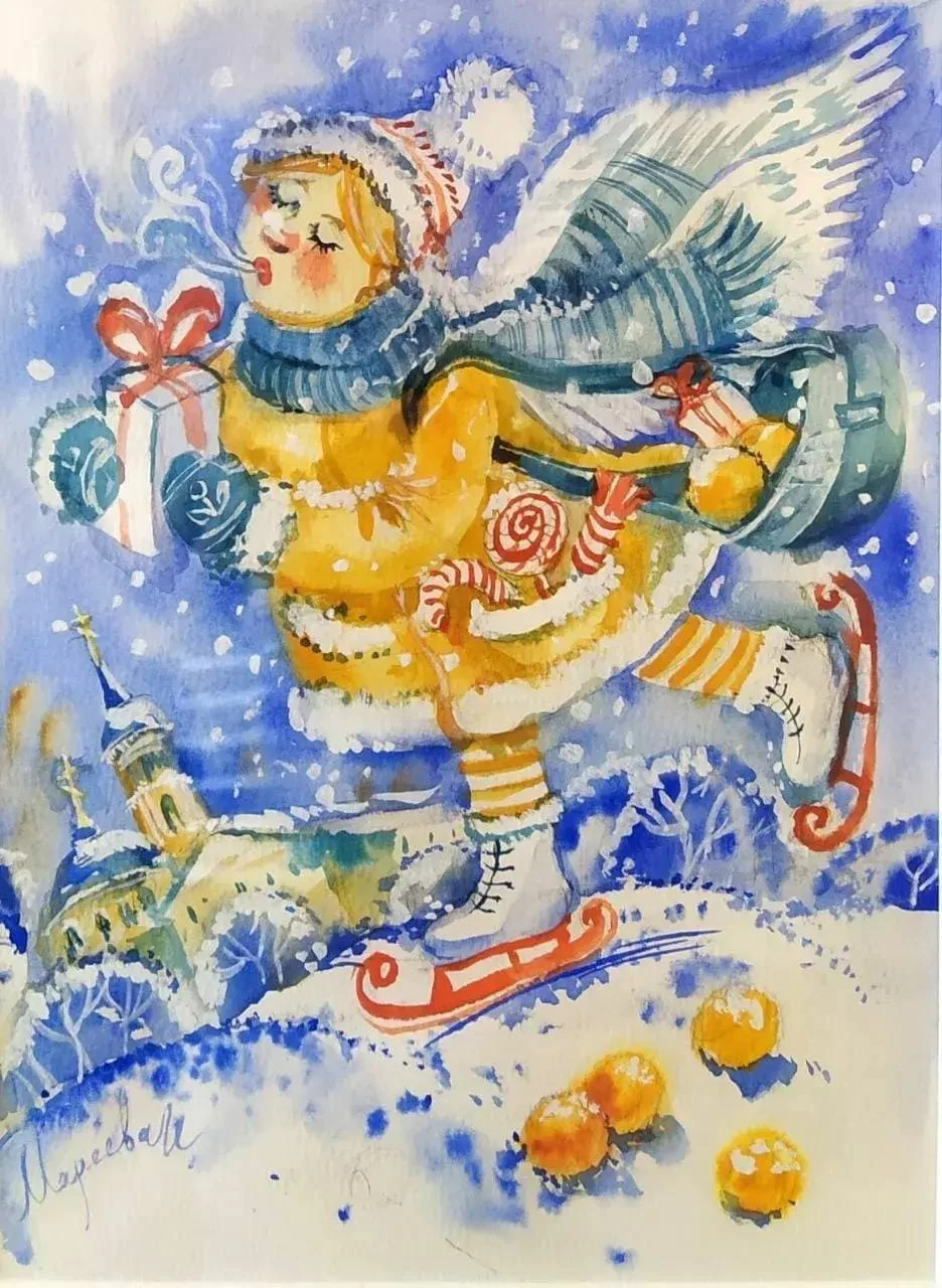 Сегодня, когда в зимней Калуге белым-бело и улицы часто скрыты за дымкой снегопадов, приятно видеть яркие цветные брызги, непредсказуемые сочетания, переходы золотых, зеленых, синих, карминовых и краплаковых оттенков... На такие комбинации Ирину Марееву, члена Союза акварелистов России, вдохновили народные росписи и русские лубки, где изначально использовались чистые цвета.