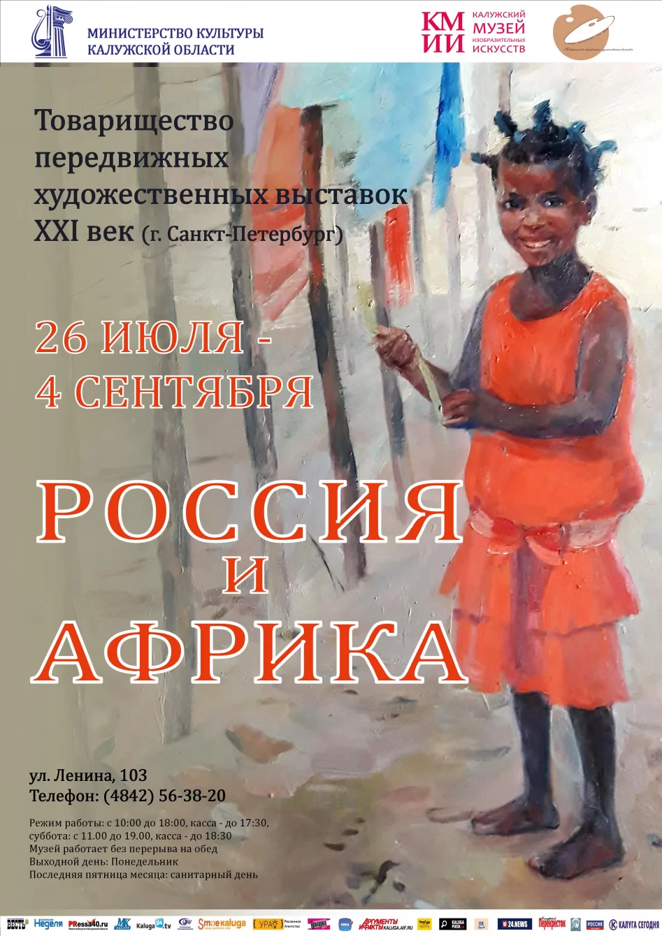 Выставка в Информационно-выставочном центре Калужского музея изобразительных искусств откроется 26 июля. Она посвящена культурному обмену между Россией и Африкой. Так, российские художники побывали в творческой командировке в ЮАР, Кении и Танзании.