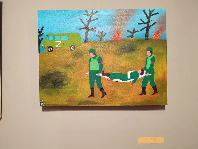 Виктор Забуга свою «наивную» работу «Группа эвакуации» написал перед тем, как ушел на фронт добровольцем. И история, которую он отразил на холсте, произошла с ним в действительности. Он был ранен, группа эвакуации его также выносила с поля боя на носилках, как он изобразил это на полотне.