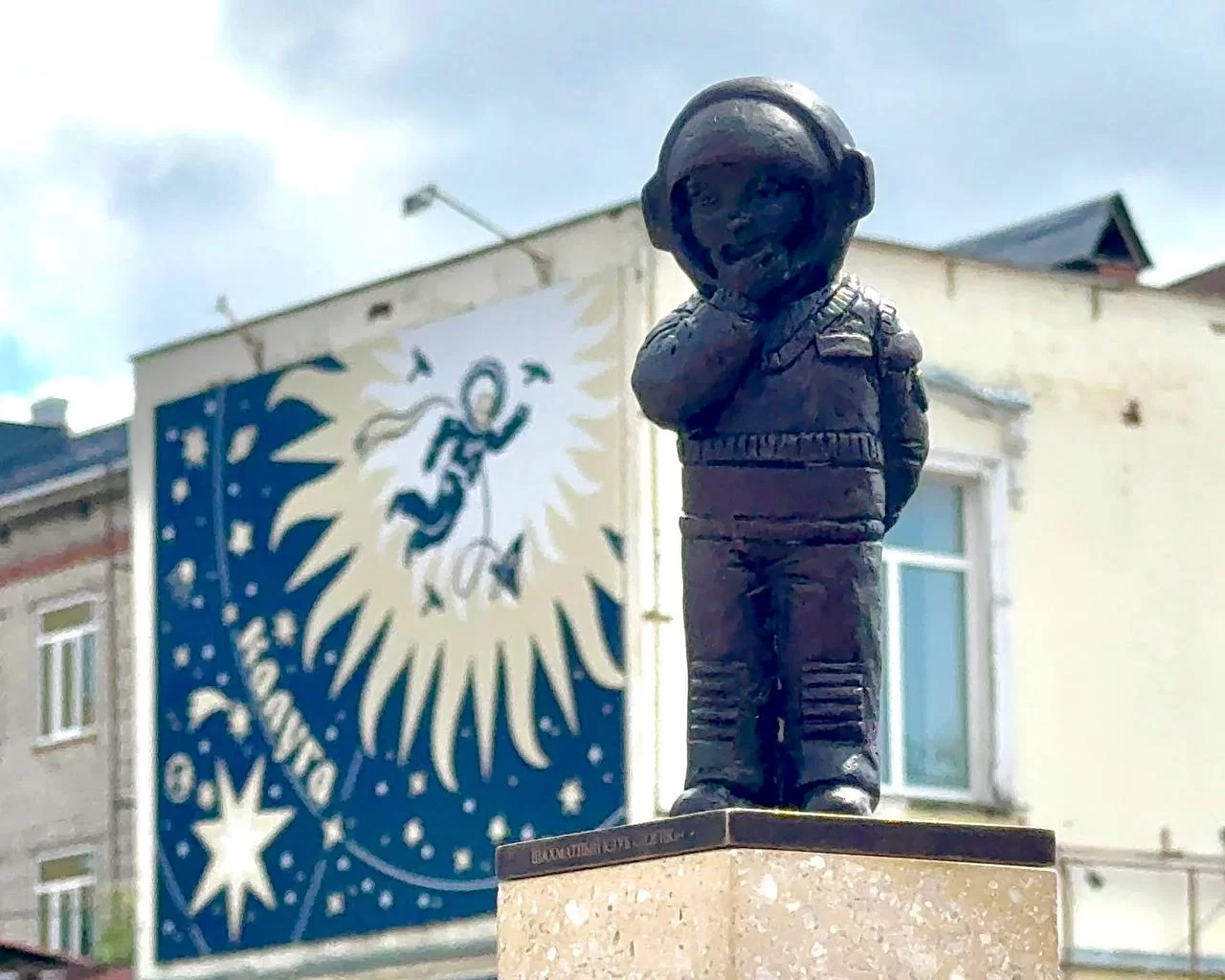 «Малыш-космонавт задумчиво разглядывает шахматную доску и решает задачу за белых — из сборника «Комбинационное искусство» М. В. Блоха. В ней белые начинают и добиваются победы», — рассказала скульптор Светлана Фарниева.