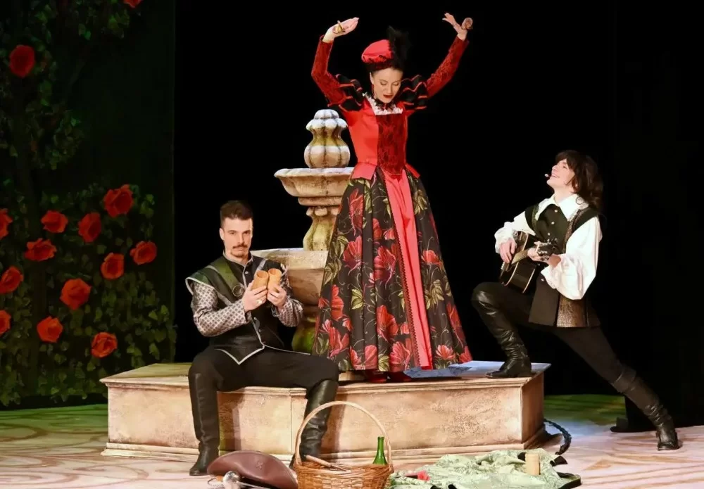 В этом легком искрометном спектакле московского режиссера, народного артиста России Николая Лазарева много музыки и пения, шуток и смеха, яркие костюмы тульского мастера Ирины Блохиной, стилизованные под старину подвижные декорации. Сцены боя поставил актер Калужской драмы Владимир Прудников - он сам отлично фехтует.