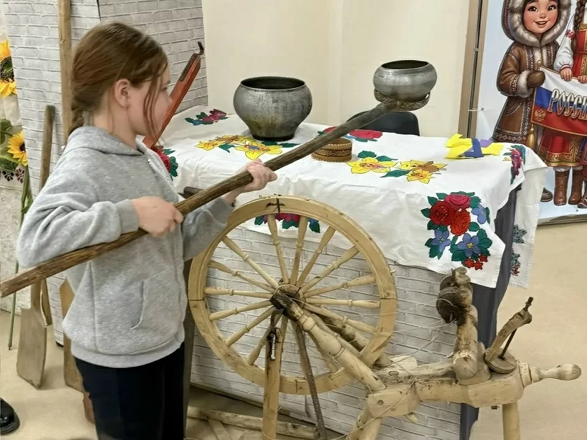 Уголок русской избы они воссоздали с помощью предметов интерьера прошлых веков: деревянных лавок, сундуков, чугунков, прялок, рушников с вышивкой и других бытовых артефактов. Школьники рассмотрели и потрогали старинные предметы, ощутив атмосферу крестьянского быта, теплоту вещей и энергетику ушедших эпох.