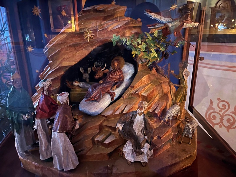 Под торжественное пение детского хора зажглись свечи и открылось окошко рождественского вертепа. Вертеп создал тарусянин, профессиональный художник Виктор Назарити. В его исполнении это настоящее произведение искусства с тонкими деталями и удивительными куклами — главными персонажами рождественской истории.