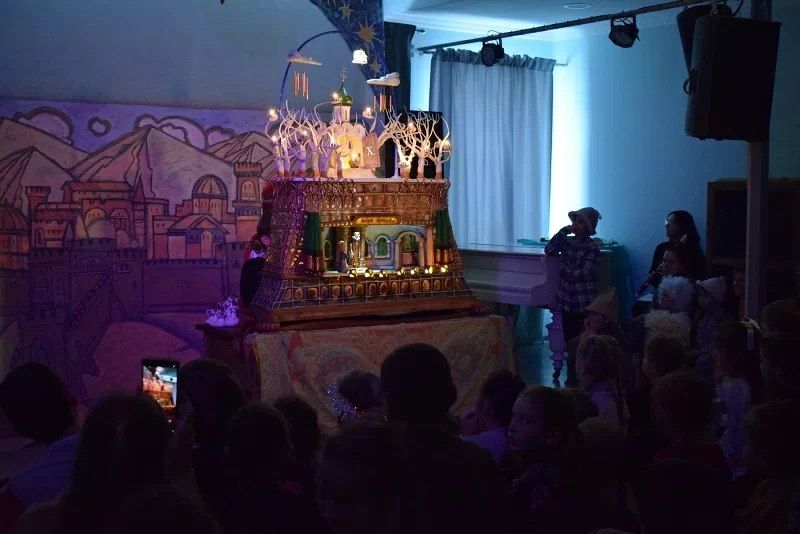 Под торжественное пение детского хора зажглись свечи и открылось окошко рождественского вертепа. Вертеп создал тарусянин, профессиональный художник Виктор Назарити. В его исполнении это настоящее произведение искусства с тонкими деталями и удивительными куклами — главными персонажами рождественской истории.
