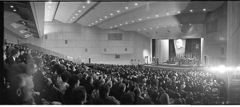 «Строительство филармонии стало для молодых рабочих не только школой новых методов и темпов ведения работ, но и настоящей школой идейного воспитания. Здесь успешно прошел Всесоюзный ленинский зачет, посвященный XXIV съезду КПСС».