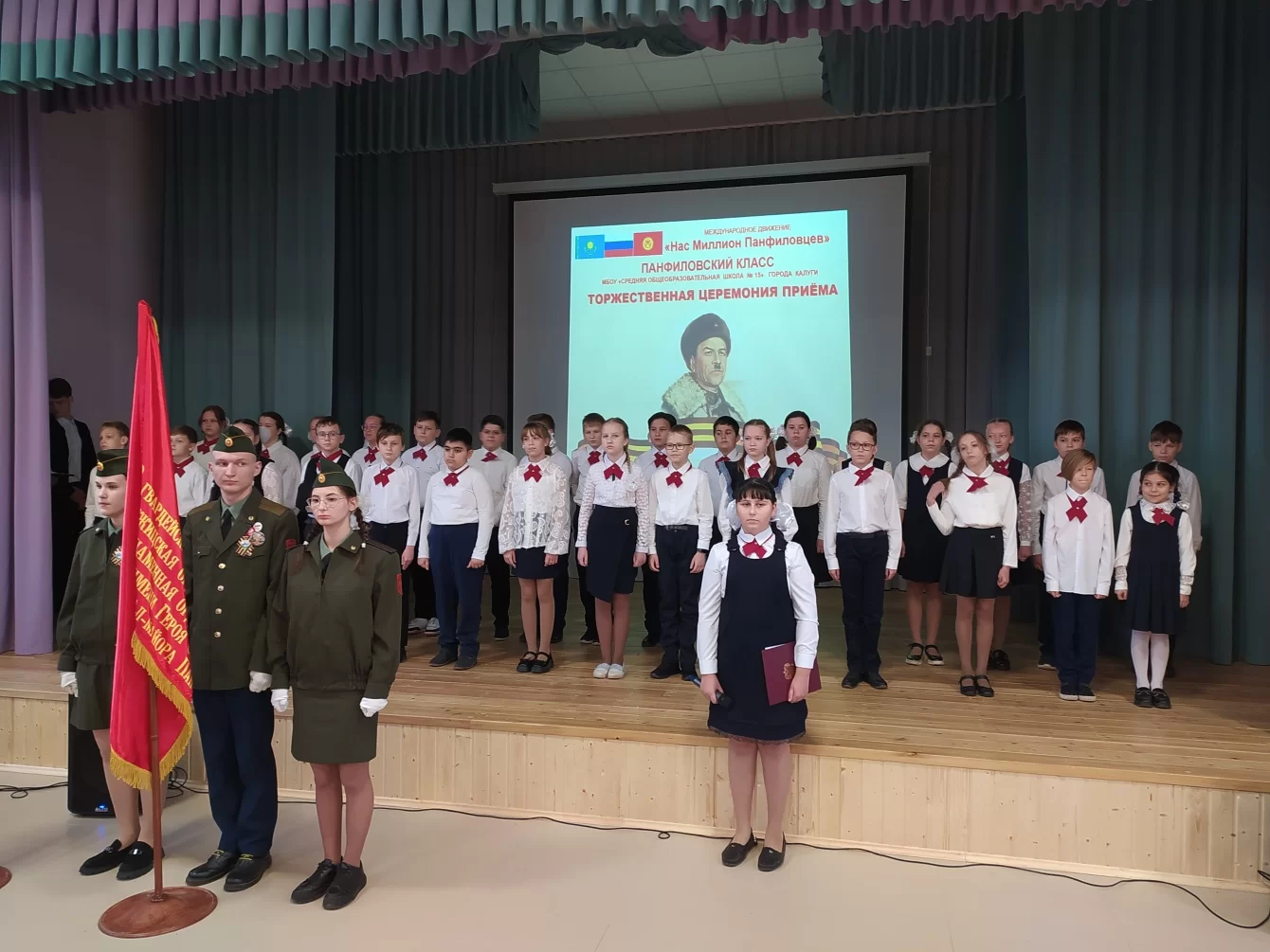 На торжественное мероприятие из далекого Казахстана приехала Айгуль БАЙКАДАМОВА - внучка легендарного комдива Ивана Панфилова, которая выступает координатором международного движения. Она первой поздравила учеников 5 «Б» с новым статусом.