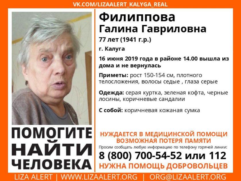 Приметы пропавшей: рост 150-154 сантиметра, плотного телосложения, волосы седые, глаза серые. Была одета в серую куртку, зеленую кофту, черные лосины, коричневые сандалии, с собой несла коричневую кожаную сумку.
