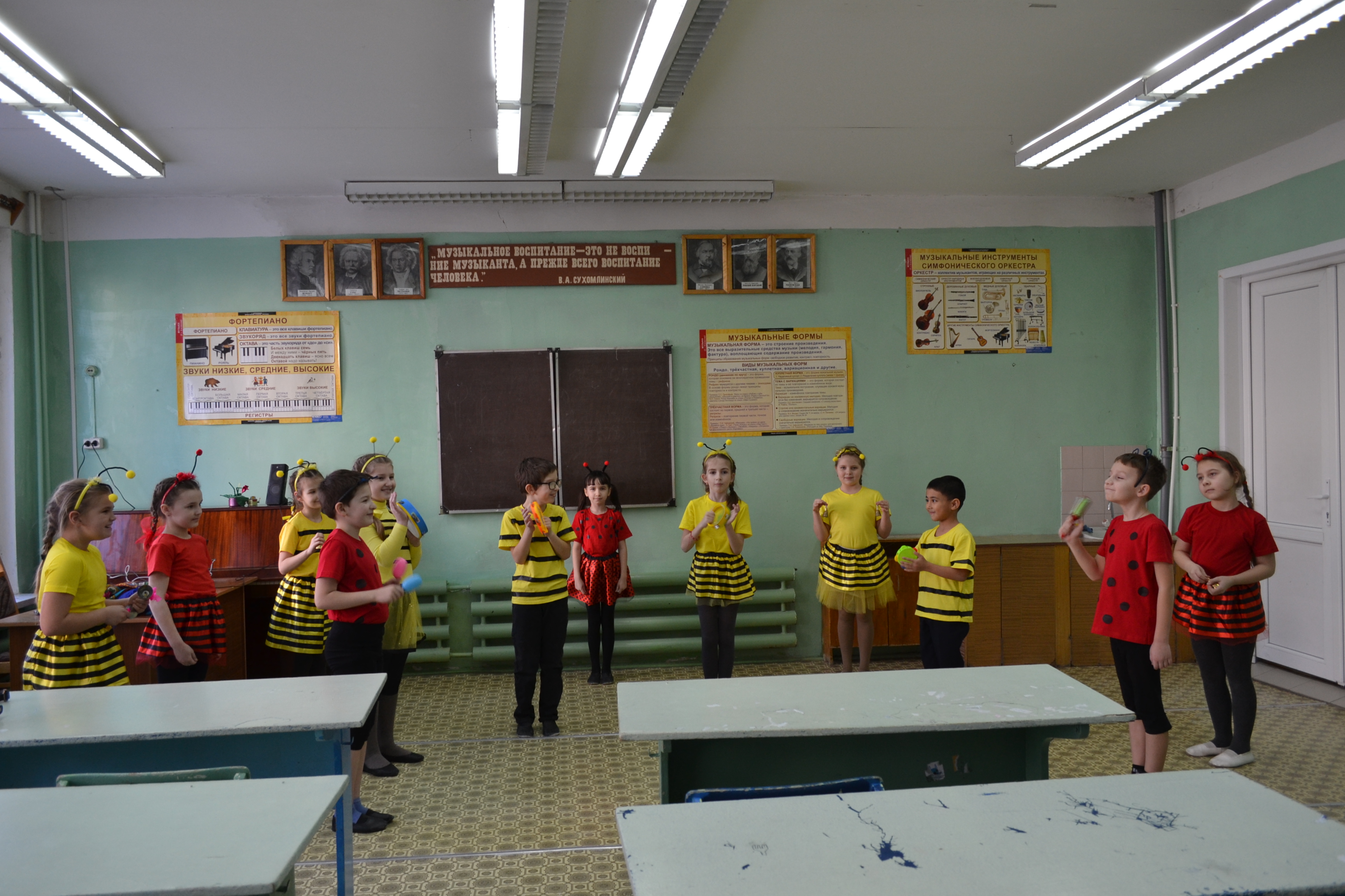 Сценический образ оркестр выбирал вместе с родителями: девочки - пчёлки, мальчики – божьи коровки. Однако репертуар у «пчёлок» нешуточный: только классические произведения. Конечно, они всего лишь аккомпанируют фонограмме солиста, по-своему «озвучивая» мелодию. Но каждому надо знать свою партию, вовремя вступить, не сбиться с ритма… И, кстати, некоторые четвероклассники из хора – даже те, кто учится в музыкальной школе и осваивает серьёзные инструменты, – немножко завидуют артистам оркестра и тоже втайне мечтают сыграть на чём-нибудь шумяще-гремящем.