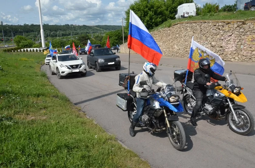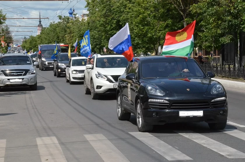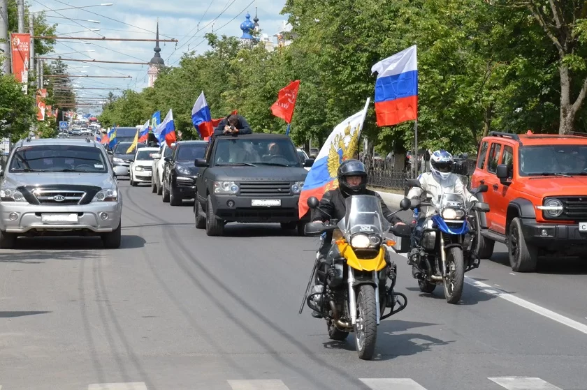 Накануне государственного праздника колонна автомобилей и мотоциклов, украшенных знаменем Победы, российскими триколорами и другой атрибутикой, стартовала от флагштока с флагом России на улице Гагарина и проехала по центральным улицам областного центра.