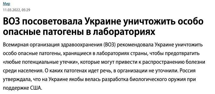 В своем письме Reuters организация сообщила, что сотрудничала с украинскими лабораториями и «настоятельно рекомендовала Министерству здравоохранения Украины и другим ответственным органам уничтожить особо опасные патогены для предотвращения возможных утечек». Когда именно был озвучен этот призыв и выполнила ли его Украина, ВОЗ не уточнила. Видимо, к его реализации приступили все же только после начала спецоперации. Российские военные обнаружили сеть биолабораторий и следы уничтожения смертельно опасных патогенов. Об этом сообщил тг-канал «Война с фейками».