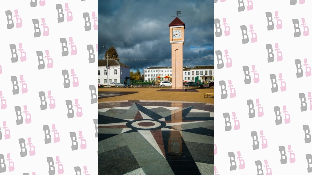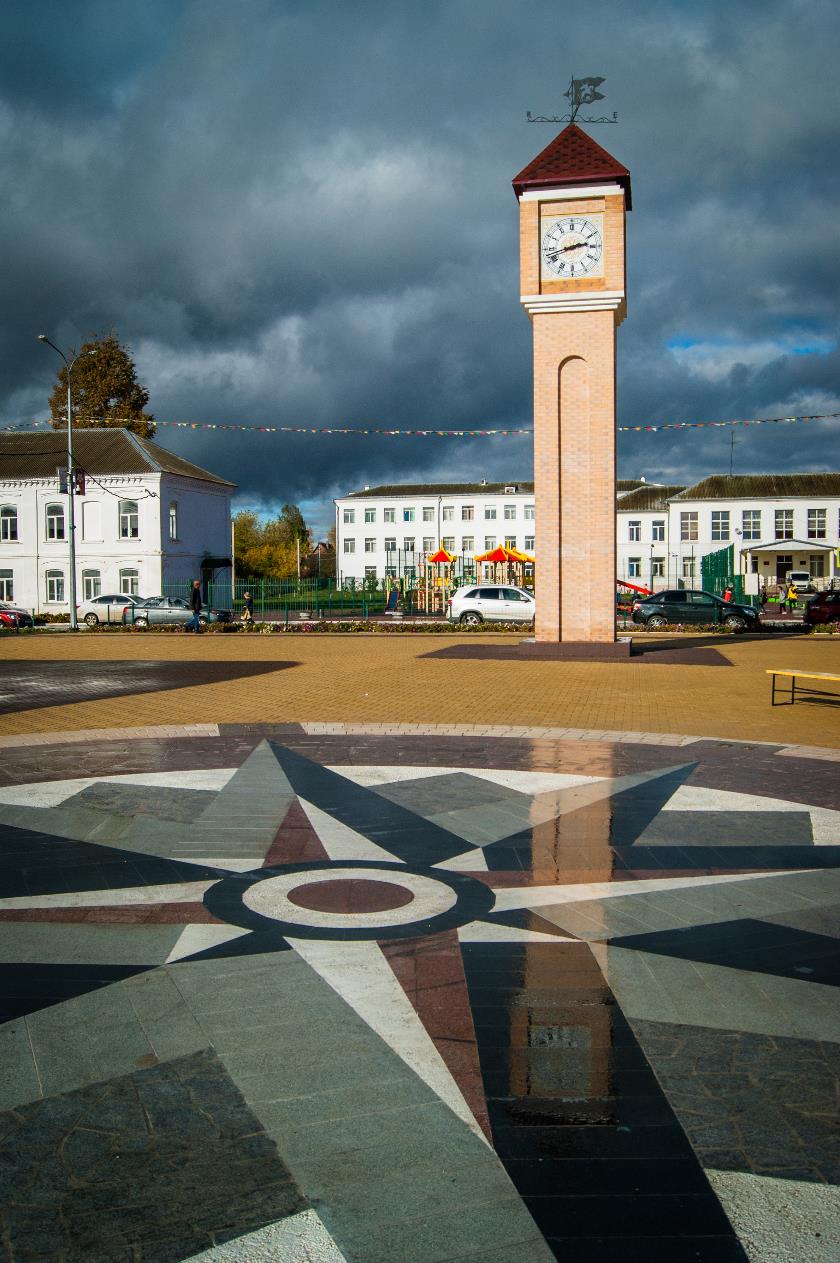 И, разумеется, сложно пройти мимо той самой часовой башни с флюгером: массивный бетонный постамент, облицованный керамогранитом; четыре циферблата, направленные также на четыре стороны света; наконец, металлический флюгер-флажок с профилем Георгия Победоносца. Кстати, часы не только хорошо видно, но и слышно издалека, - каждые полчаса гулкий бой курантов извещает о текущем времени.