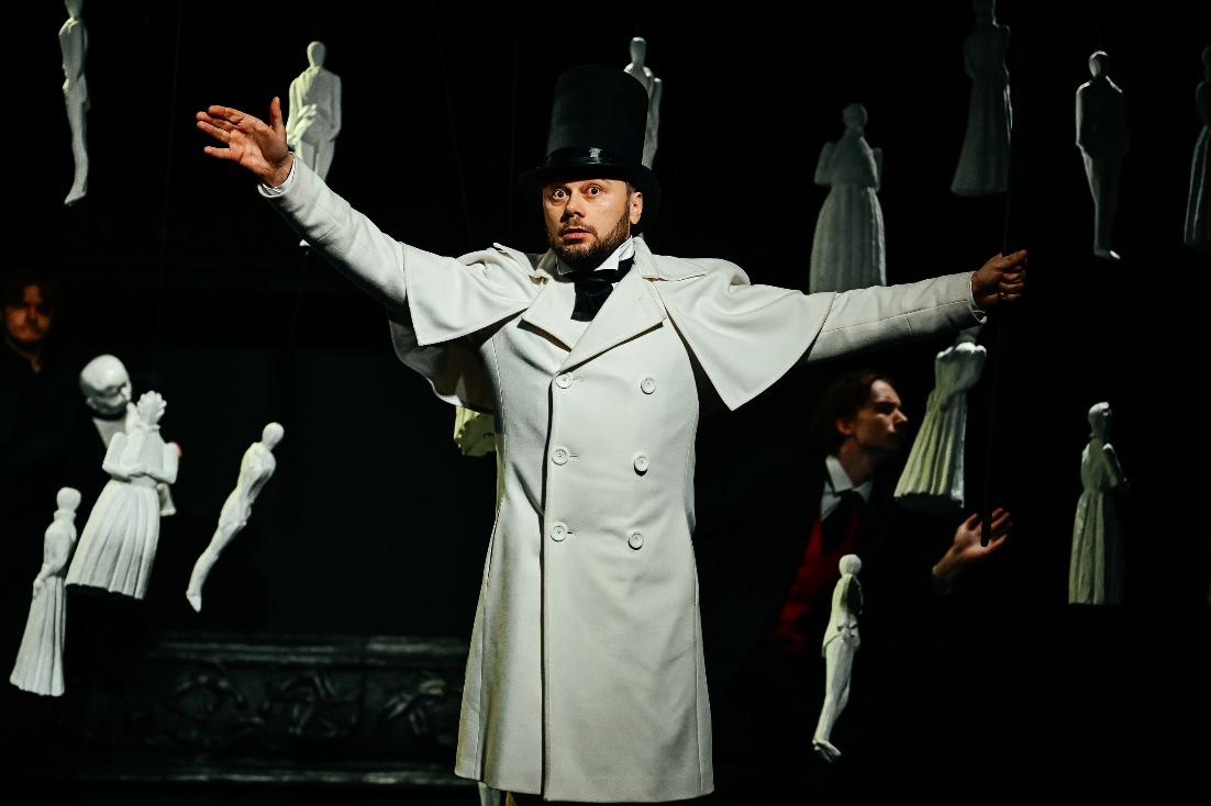 – Ближе к финалу Чичиков произносит вслух имена купленных мертвых душ, и они вдруг начинают появляться из-за рамки экрана. Это выглядит инфернально. Как и тройка в начале спектакля.