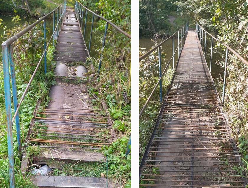 Как видно на снимке, ходить по мосту было сложно и даже небезопасно: металлические прутья, из которых он сварен, регулярно выламывают «лица с низкой социальной ответственностью». Мужчины сначала кинули клич в соцсетях в поисках генератора, а затем «отчитались о проделанной работе», разместив фото обновлённого моста.