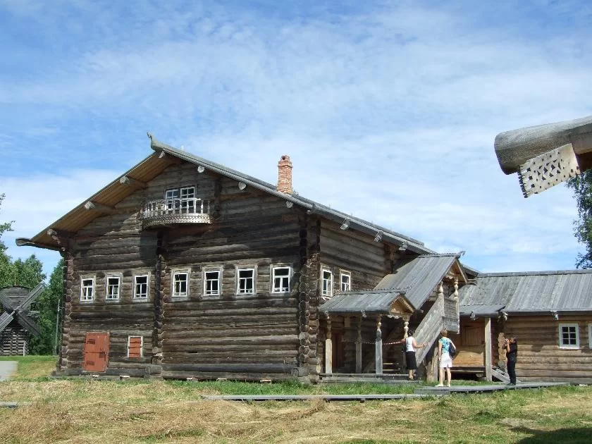 Мое внимание привлек дом Пухова, 1812 год, самая старинная из жилых построек музея. Хозяин возвел его в деревне Большой Холуй ныне Каргопольского района. Он стоял в самом центре, выделяясь своими размерами, декором и планировкой. Жилая часть представляет собой высокий симметричный сруб на две избы – летнюю и зимнюю. На уровне чердака устроена светелка – летнее неотапливаемое помещение. В ней пили чай и вели разговоры с гостями. В доме есть еще одно помещение – келья с отдельным входом. По преданию, в ней хозяин давал пристанище старообрядцам, скрывающимся от гонений. Распашные резные ставни фактически – наличники. Они неподвижны, и главное их назначение – защита оконных косяков от влаги. Особую красоту придают резные доски – прищелины. Вверху, под крышей, на их стыке сделано солнце, от которого во все стороны отходят деревянные лучи. Это своеобразный оберег – пожелание благополучия и счастья семье. Хозяйственный двор скрыт за жилой частью. Семья Пуховых была зажиточной. Они ходили на охоту, в хозяйстве держали коров, лошадей, овец. На огороде сажали лук, капусту, брюкву, репу, картофель. Всего в Большом Холуе стояло тогда свыше ста изб. Это лишь одна история, которую хранят потемневшие от времени бревна и резные доски. Академик Дмитрий Лихачев очень точно отметил: «Самое главное, чем Север не может не тронуть сердце каждого русского человека, – это тем, что он самый русский. Он спас нам от забвения русские былины, русские старинные обычаи, русскую деревянную архитектуру, русскую великую лирическую стихию – песенную, словесную, русские трудовые традиции – крестьянские, ремесленные, мореходные, рыболовецкие».