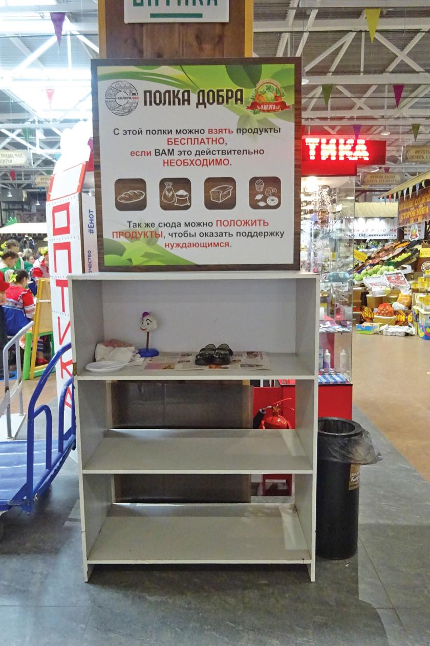 В декабре 2017 года вышло постановление губернатора Анатолия Артамонова «Об организации на территории Калужской области акции «Полки добра». В нем говорилось, что нужно поддержать инициативу калужских предпринимателей и распространить положительный опыт по созданию в магазинах «полок добра».