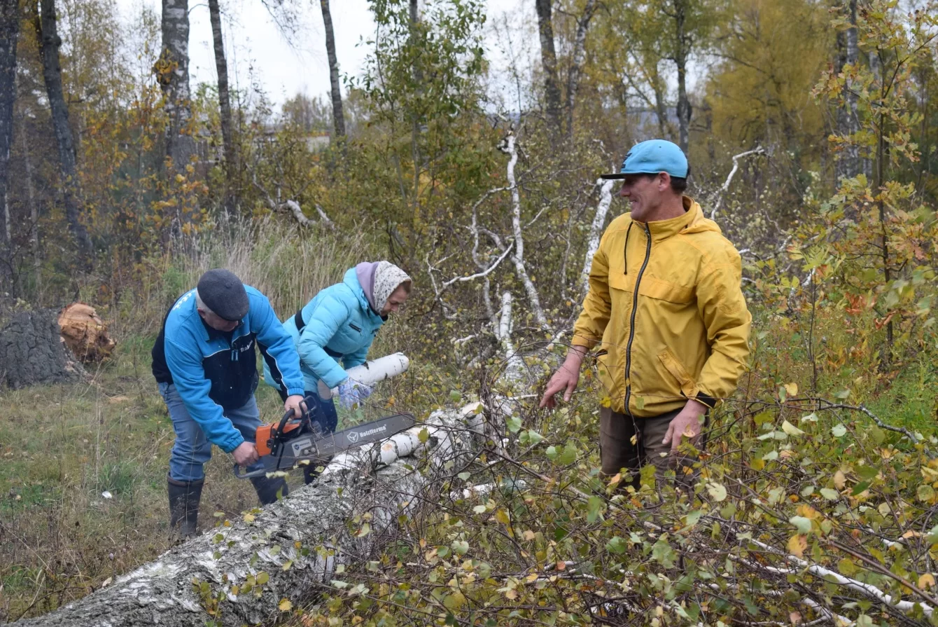 Всего в овраге было отмечено 13 аварийных деревьев. Если перевести это количество древесины в кубометры, получится примерно 10-12 кубов, или два самосвала с дровами. За один раз успели спилить пять берез, в дальнейшем работа будет продолжена.
