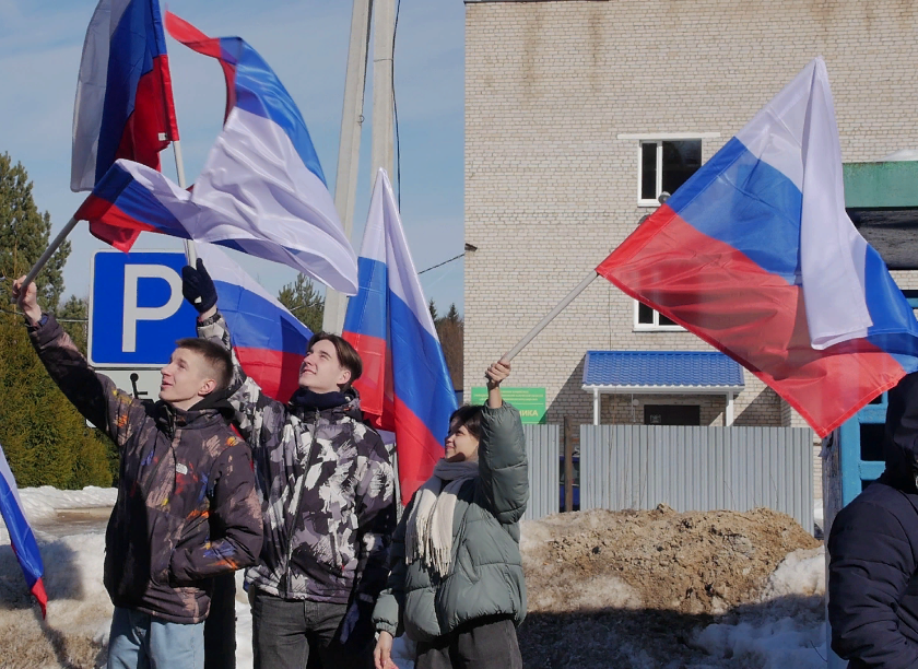 По городу проехали машины, украшенные российскими флагами, буквой Z, ставшей символом поддержки армии России, и лозунгами «Zа Путина»!», «Zа победу!».