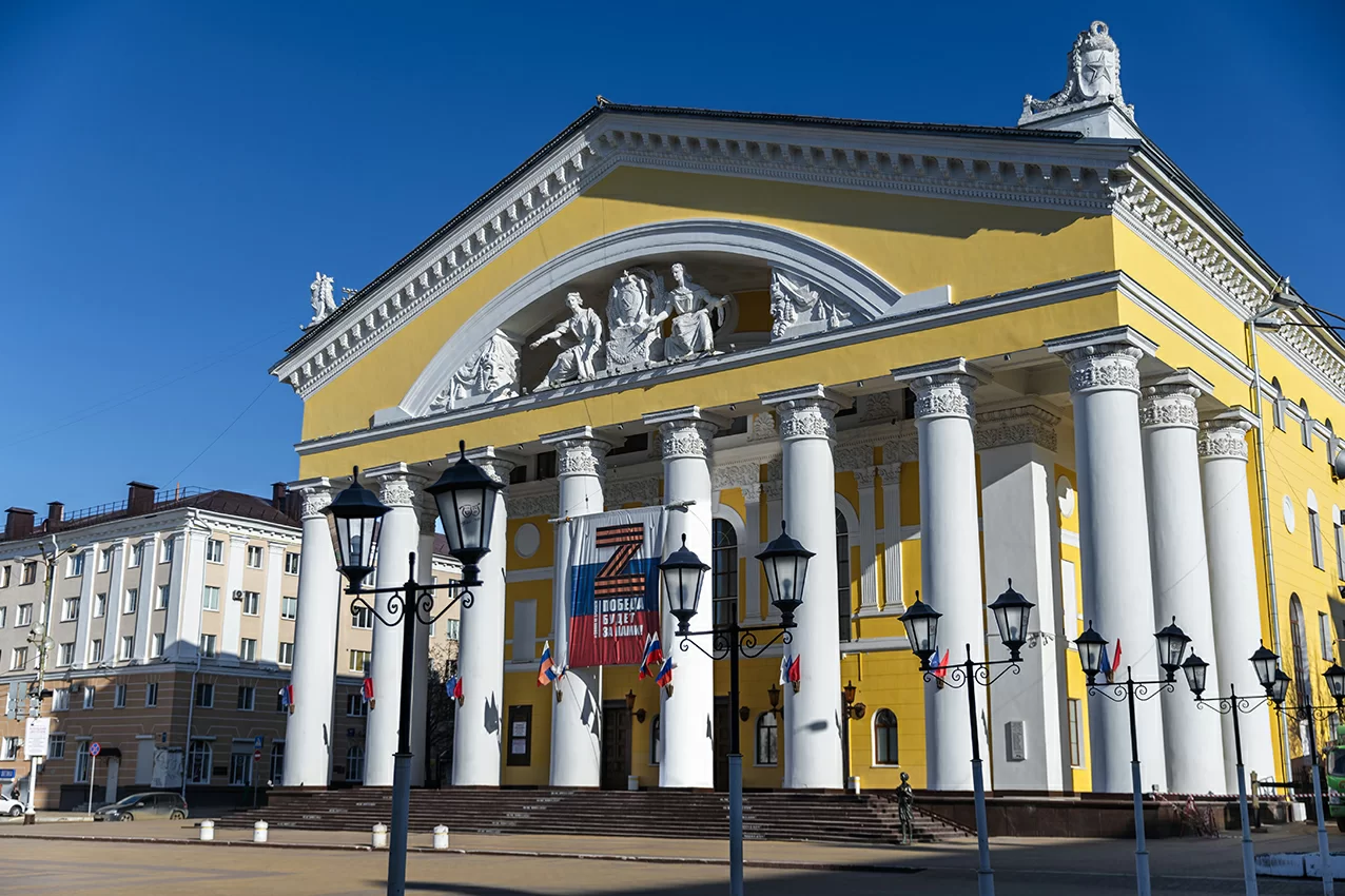 3 декабря 1958 года торжественно открылось современное архитектурное сооружение на Театральной площади и состоялся показ первого спектакля «Кремлевские куранты» Н.Погодина. Общее руководство застройкой площади осуществил один из крупнейших архитекторов СССР — академик Иван Жолтовский. Проект здания драмтеатра принадлежит Георгию Напреенко.Здание спроектировано в стиле неоклассицизма, характерного для советской архитектуры середины ХХ века. Образцом фасада послужили древнегреческие монументальные здания. Театр украшают мощные колонны, поддерживающие массивный фронтон. Верхнюю часть здания венчают женские фигуры, предположительно олицетворяющие муз: одна из них держит лавровый венок, символ славы, другая склонилась над раскрытой книгой. С обеих сторон от фигур расположены традиционные древнегреческие театральные маски, а в центре композиции – герб РСФСР.