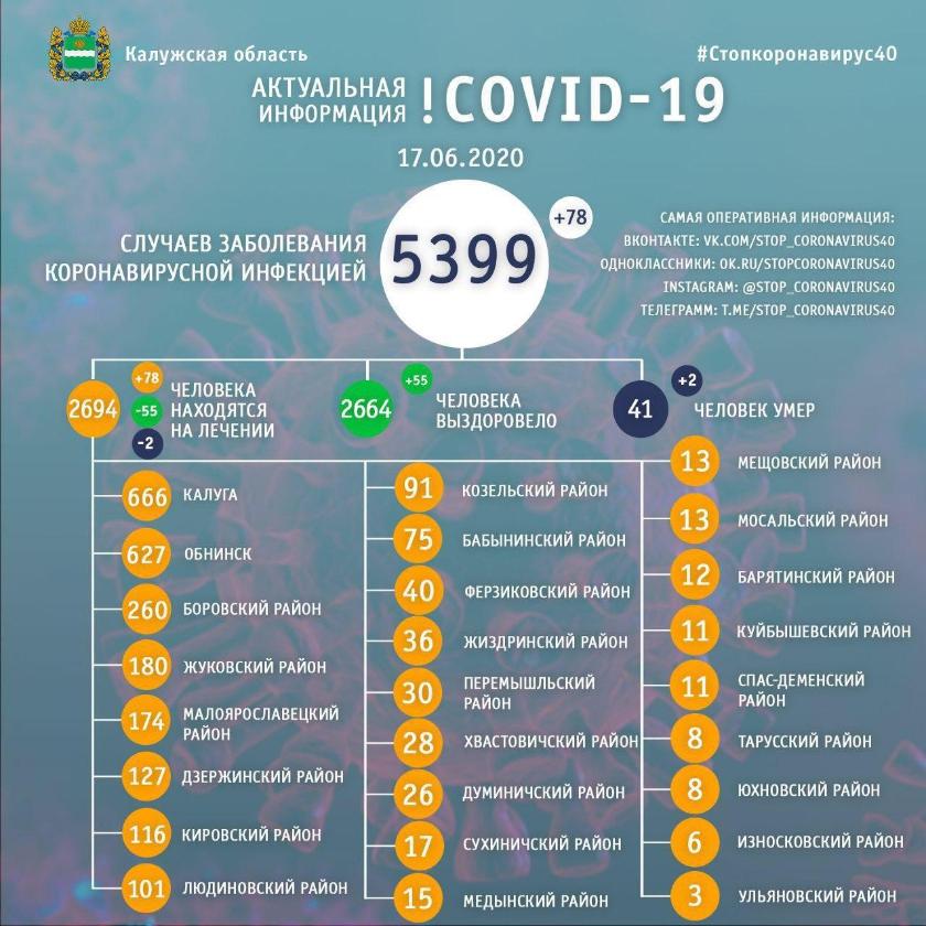 Обновленную статистику на 17 июня опубликовал оперативный штаб региона. Сообщается, что за сутки в области диагноз COVID-19 подтвердился у 78 человек, общее число заболевших в период пандемии составляет 5399. Половину их них — 2664 человек врачи вылечили, за последние сутки выписаны 55 пациентов, их анализы показали отсутствие в организме вируса.