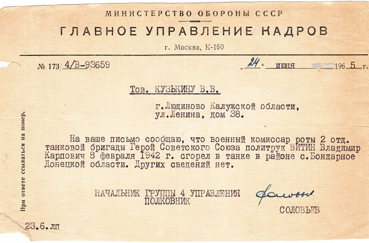 В начале 1942 года 37-я армия Южного фронта вела ожесточенные бои, 2-я танковая бригада была на самом опасном месте. Комиссар Витин всегда руководствовался правилом – быть там, где тяжело, и все трудности и опасности честно делить с рядовыми воинами-танкистами. И когда потребовалось выполнить особо ответственное и опасное задание, он взял его на себя.