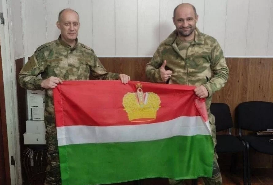 Депутат Заксобрания области, глава регионального исполкома ОНФ Дмитрий Афанасьев передал флаг Калужской области командиру Отдельного разведывательного батальона «Спарта» Артёму Жоге.