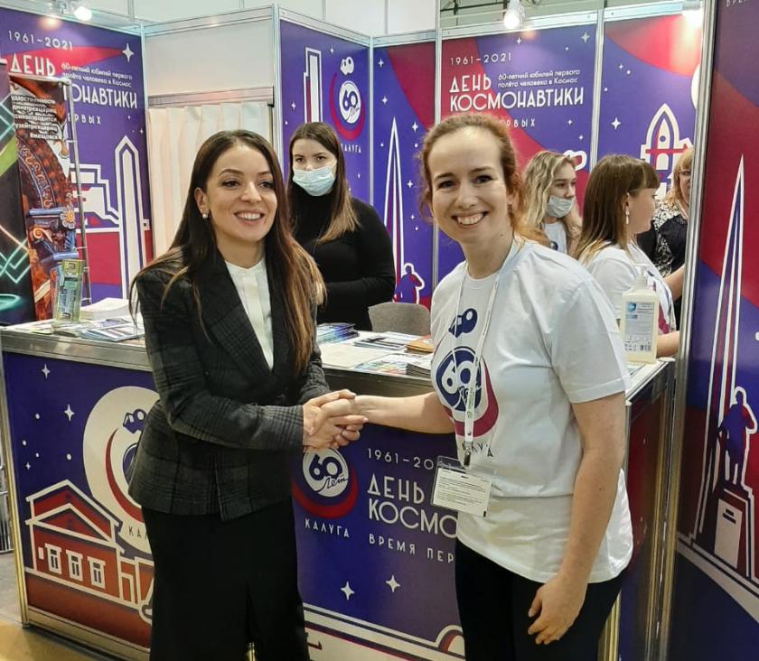 В день открытия выставки Глава Ростуризма Зарина Догузова ознакомилась с экспозицией стенда проекта «Императорский маршрут», где ей подробно рассказали о его реализации в регионах, в том числе и в Калужской области, которая является регионом-координатором данного проекта в 2020-2021гг. Руководитель Туристско-информационного центра "Калужский край" Татьяна Каледина пригласила главу Ростуризма к калужскому стенду, оформленному в космической тематике в связи с 60-летием полета Юрия Гагарина в космос. Главной темой беседы стало предстоящее открытие в Калуге второй очереди музея космонавтики. В преддверии 12 апреля Ростуризм уделяет большое внимание теме космоса. Зарине Догузовой понравился калужский стенд. Она подчеркнула, что считает важным событием открытие такого уникального музея в Калуге и пожелала успехов представителям нашего региона в реализации всех туристических проектов.