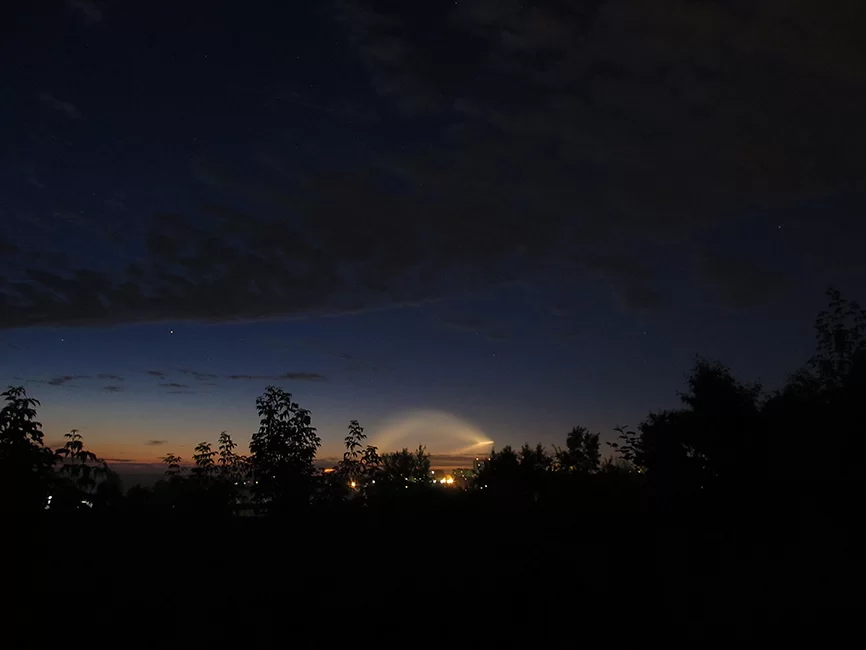 Часто ли можно увидеть подобный пуск из нашего космического города? Нет. Нужно редкое сочетание условий для таких сверхдальних наблюдений: Солнце должно быть за горизонтом, но и не ниже 10-12 градусов, небо должно быть ясным не только между наблюдателем и ракетой, но и на линии подсветки...