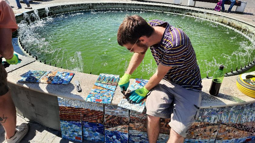 Мозаичные фрагменты — всего их 97 — создали профессиональные художники, взрослые и маленькие жители города. На днях части панно были смонтированы на чашу фонтана.
