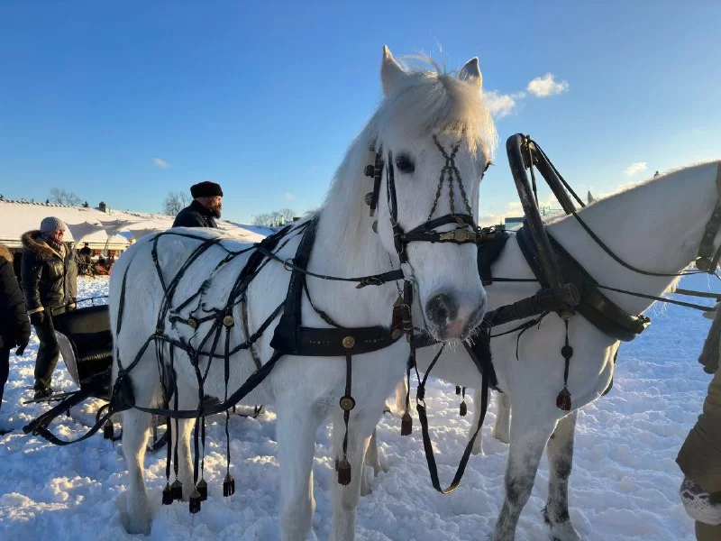 Несколько сотен человек, в том числе совсем юные гости, смогли с ветерком прокатиться на двух тройках по историческому Выводном кругу ВДНХ. Две упряжки чёрных и белых лошадей ждали посетителей выставки у Центра национальных конных традиций.
