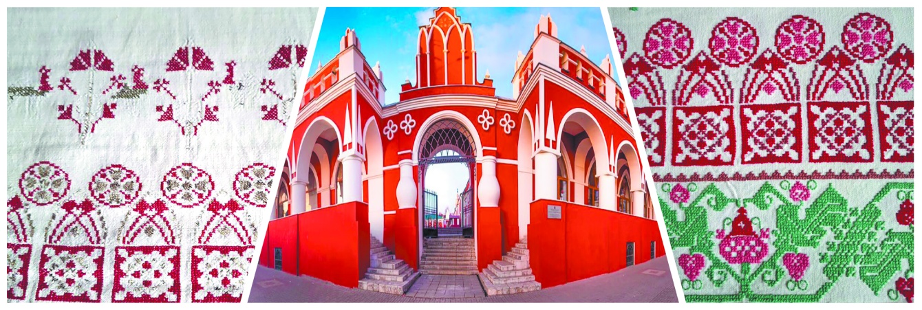 Как гласит семейное предание, однажды молоденькая калужская мещанка Мария Андрияновна Овсянникова отправилась на променад к Гостиным рядам. Так ей нравились арки, башенки, заостренные окна, что решила Мария этот шедевр русской готики вышить. Дома расстелила миллиметровую бумагу и стала прикидывать будущий рисунок… В 1875 году появился свадебный рушник с… Гостиными рядами. Когда прапраправнук Марии Андрияновны по линии отца Андрей Шапин показал его, мы с коллегами были удивлены – так, сохраняя народную стилистику, знаковое место Калуги никто не изображал! Андрей – вышивальщик в пятом поколении. Работу своей прапрапрабабушки он повторил в новом рушнике, от себя добавил плодов и цветов.