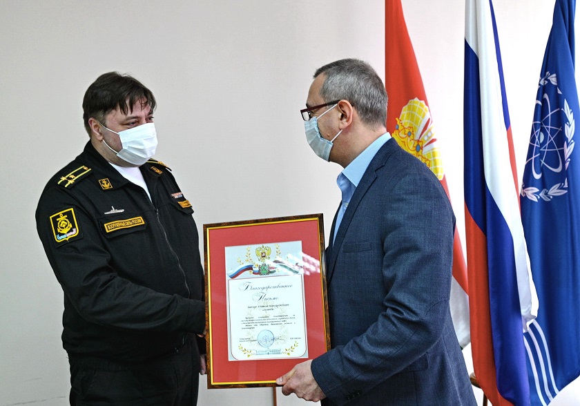 Подарком подводникам стали комплекты формы, сшитые по индивидуальным меркам членов экипажа и с эмблемой города науки. Губернатор вручил командиру субмарины Благодарственное письмо за высокопрофессиональное исполнение служебного долга и безупречное выполнение поставленных задач.