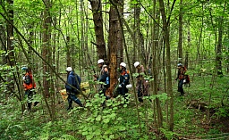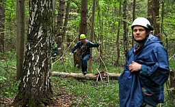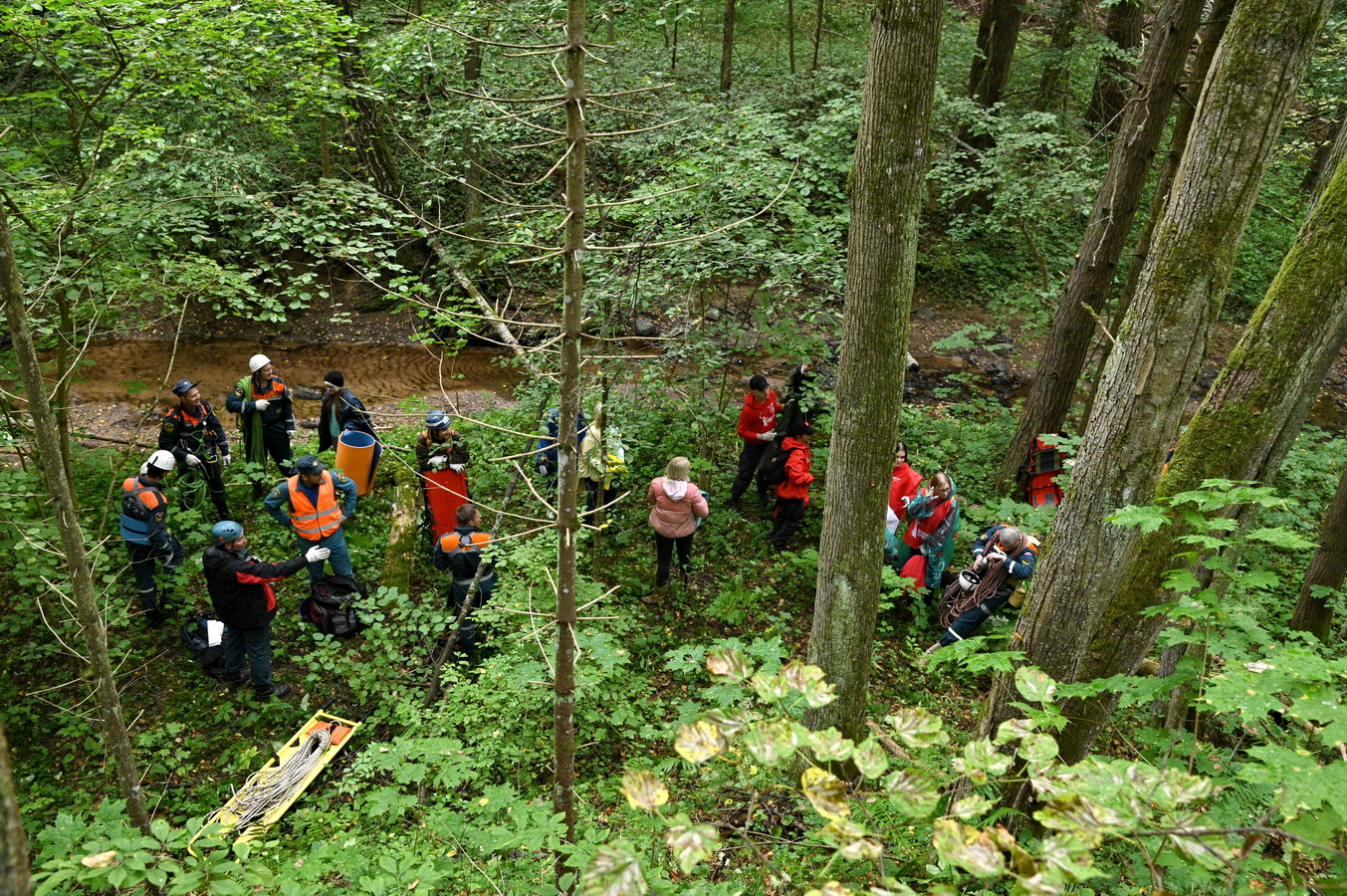 – Я сам грибник. Случалось в лесу заблудиться, – поделился Юрий Пшеничный, заместитель атамана Калужского городского казачьего общества. – В этом случае паника – самый главный враг, а помощник – знания. Сюда мы прибыли вместе с волонтерской ротой «Боевое братство». Наша задача – получить базовые навыки по поиску людей в лесу, оказанию первой медицинской помощи, научиться, как действовать слаженно с другими подразделениями в зоне ЧС.Цветные пятна дождевиков на зеленом. Дождь продолжал свое мокрое дело. Первая группа отправилась на поиски в лес. Говорят, здешние труднопроходимые овраги – это Демидовские ямы – старый заросший карьер по добыче руды, где также нажигали древесный уголь для завода на Вырке. Все тяготы пешего перехода разделили со спасателями и волонтерами операторы телевидения и наш фотокор Георгий Орлов. Чавкает под ногами подстилка. Лес кажется бесконечным. Наконец залаяли собаки. Нашли! Одного, второго, третьего… Условным пострадавшим оказывают первую медицинскую помощь. Тех, кто не может идти, укладывают на носилки. Но впереди самый сложный этап – переправа. Надо отработать подъем из глубокого оврага по почти вертикальным так называемым перилам не только «пострадавших», но и кинологических расчетов.