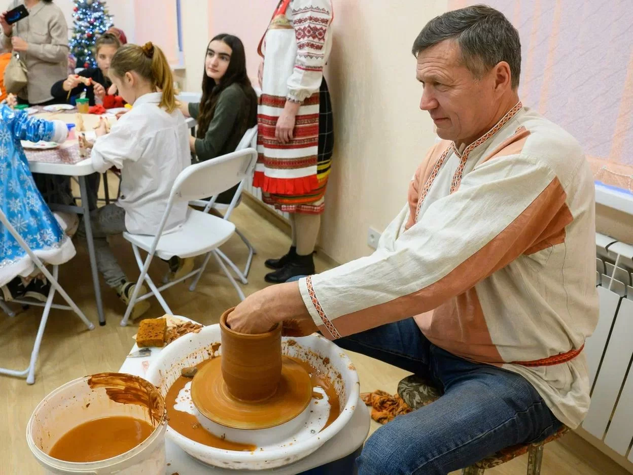 А в коридоре светлого уютного дома, где старина в виде глиняных вывесок-свитков (которые прошли обжиг в здешней муфельной печи) соседствует с сенсорной информационной панелью, гостей встретил ансамбль «хлудневских соловьев». Юные думиничане, собравшиеся на мастер-классы, во главе с Дедом Морозом исполнили приветственную мелодию на хлудневских свистульках. Получилось впечатляюще и в тему.