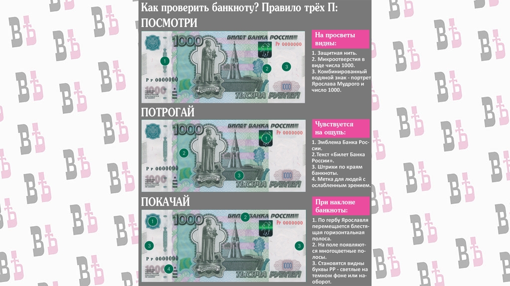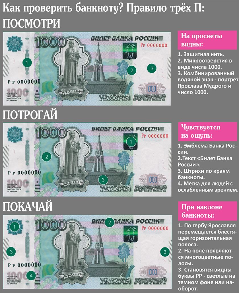Чтобы убедиться, что банкнота настоящая, нужно проверить не менее трех-пяти защитных признаков разными способами: на ощупь, на просвет, при наклоне. Для удобства можно воспользоваться бесплатным мобильным приложением «Банкноты Банка России», которое в интерактивном формате показывает, где на банкнотах расположены защитные признаки.