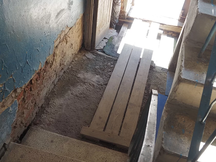 Подъезд спецавтотранспорта для откачки септиков крайне затруднен из-за вязкости заболоченного канализационными стоками грунта, сообщают из БТИ. Здесь надо засыпать заболоченную территорию, которая уже добралась и до колодца с чистой водой. Кроме того, по заключению специалистов БТИ, лестничные марши и пол в коридорах частично разрушены, что может служить причиной для травмирования жильцов.
