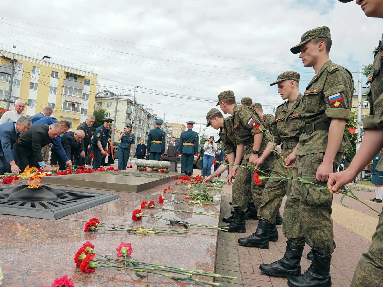 «» «Мы, как и наши отцы, деды и прадеды на Курской дуге в Великую Отечественную войну, выполнили свой воинский долг на курской земле в 2024-м, тоже выстояли. Я хочу заверить, что враг будет побежден, победа будет за нами. Она недалеко, осталось недолго, когда враг будет вынужден капитулировать», - сказал он.На площади Победы помощник командира 28 ракетной дивизии по работе с верующими военнослужащими иерей Николай Кузнецов провел литию по погибшим воинам-защитникам Отечества. Затем свечи от лампады с частицей Вечного огня поочередно зажгли представители воинских частей Калужского гарнизона, движения «Юнармия», волонтеров Победы, поискового движения России, движения Первых, молодежного движения Народного фронта.